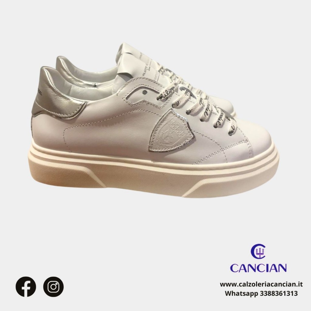 SPORTIVA PELLE BIANCA, TALLONE ARGENTO, PROFILO SCUDETTO ARGENTO LACCIO LOGATO, FONDO ALTO.