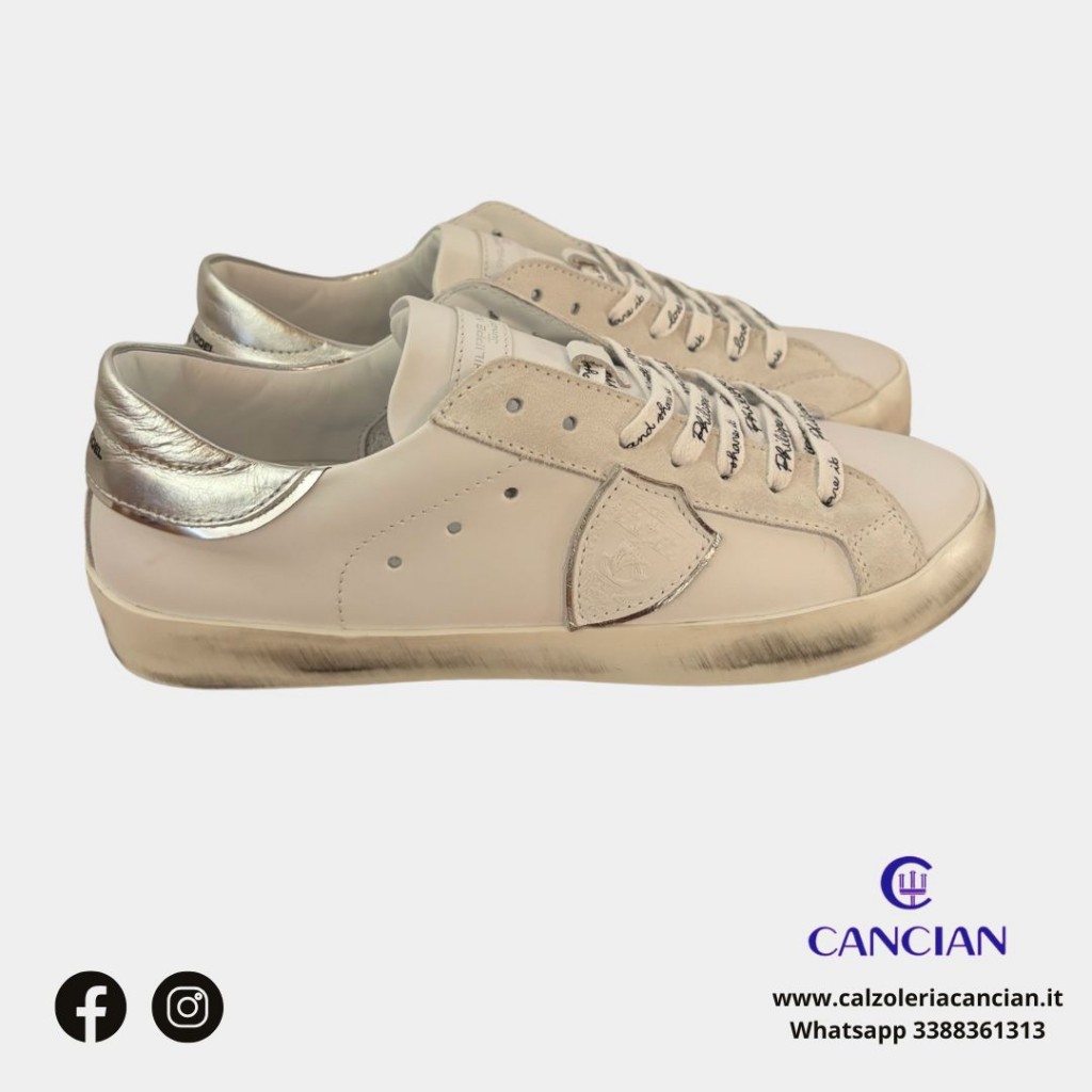 SPORTIVA PELLE BIANCA, TALLONE ARGENTO, PROFILO SCUDETTO ARGENTO, LACCIO LOGATO.