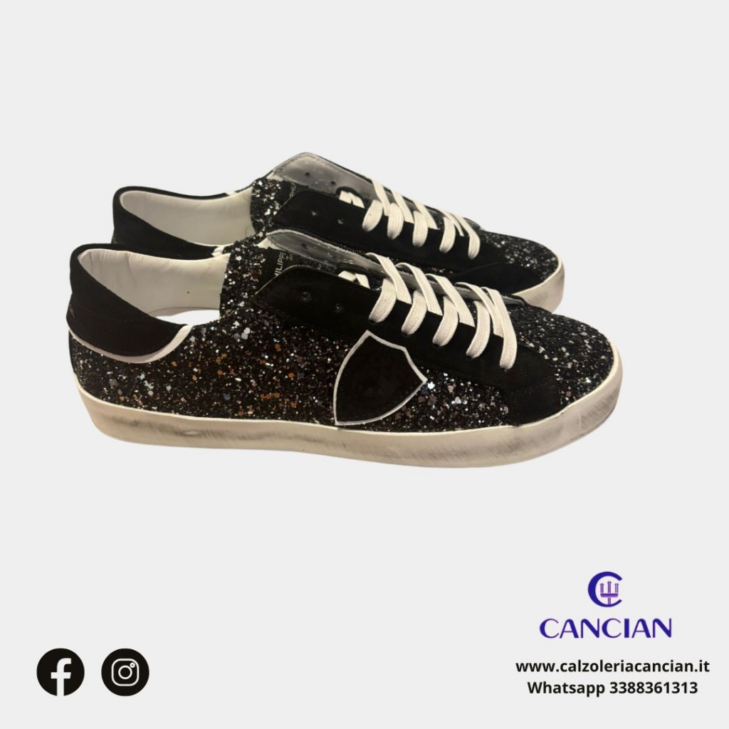 SPORTIVA GLITTER NERO, DETTAGLI CAMOSCIO NERO, LACCIO BIANCO.