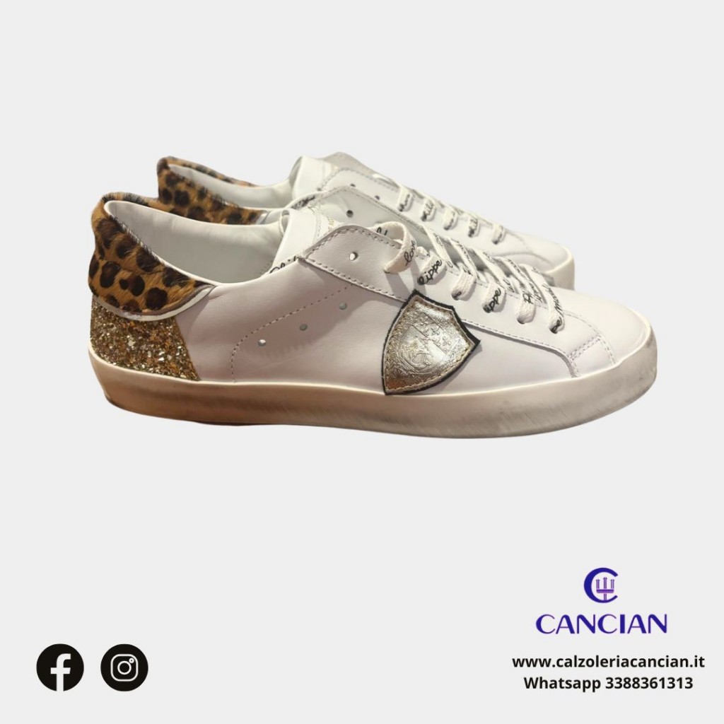 SPORTIVA PELLE BIANCA, TALLONE CAVALLINO LEO E GLITTER ORO, SCUDETTO ORO, LACCIO BIANCO CON LOGO.