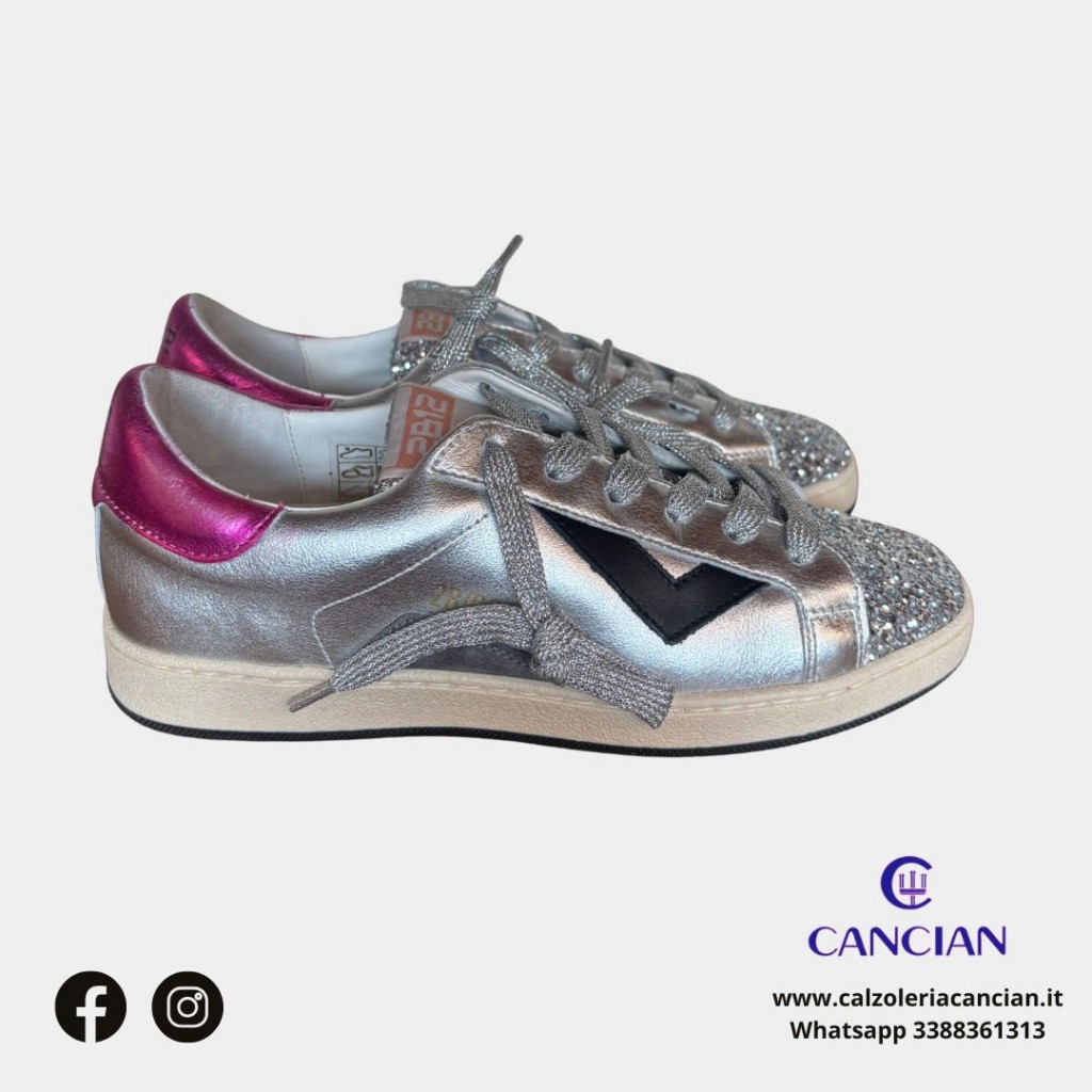 SPORTIVA PELLE LAMINATA E GLITTER ARGENTO TALLONE FUXIA LACCIO.