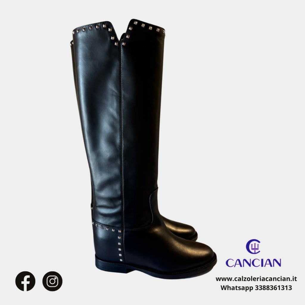 STIVALE PELLE BORCHIE ARGENTO CALZATA TUBOLARE ZEPPA INTERNA 4 CM.